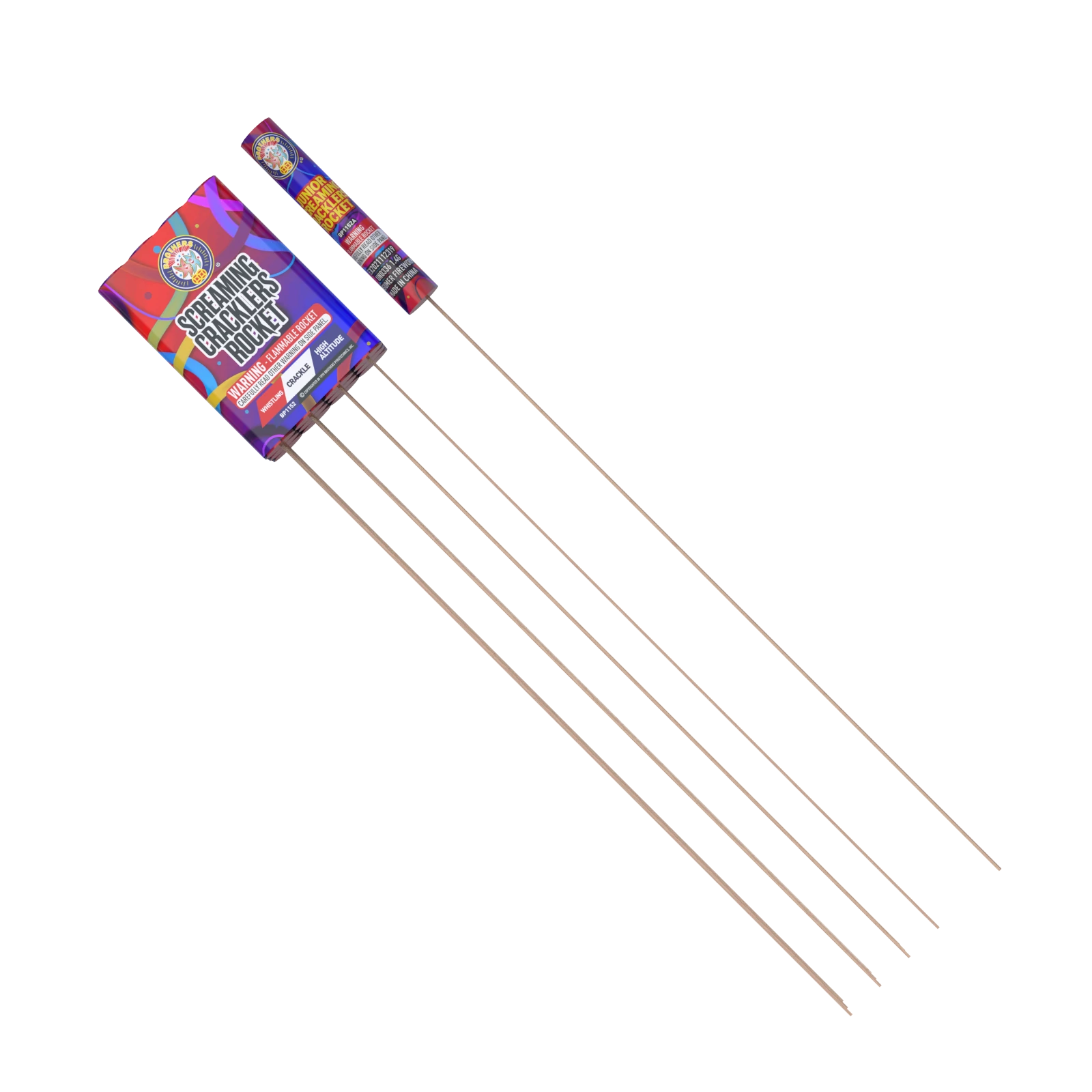 Variety pack of rockets - Brocade to red stars. Brocade to green stars. Brocade to multicolored stars. Titanium palms to crackling flowers. Red stars with silver glitter. Blue stars with silver glitter.