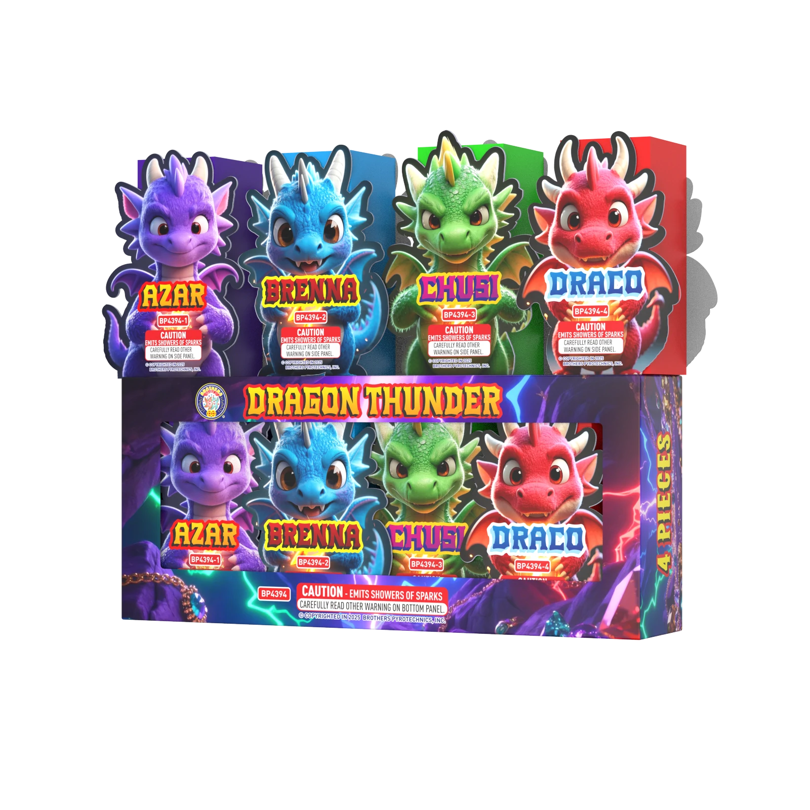 Azar - purple spray then jumbo crackling sunflowers with purple and green stars. Brenna - blue spray then silver lasers with red and yellow stars. Chusi - green spray then silver chrysanthemums with green and purple stars. Draco - red spray then jumbo crackling sunflowers with red and blue stars.
