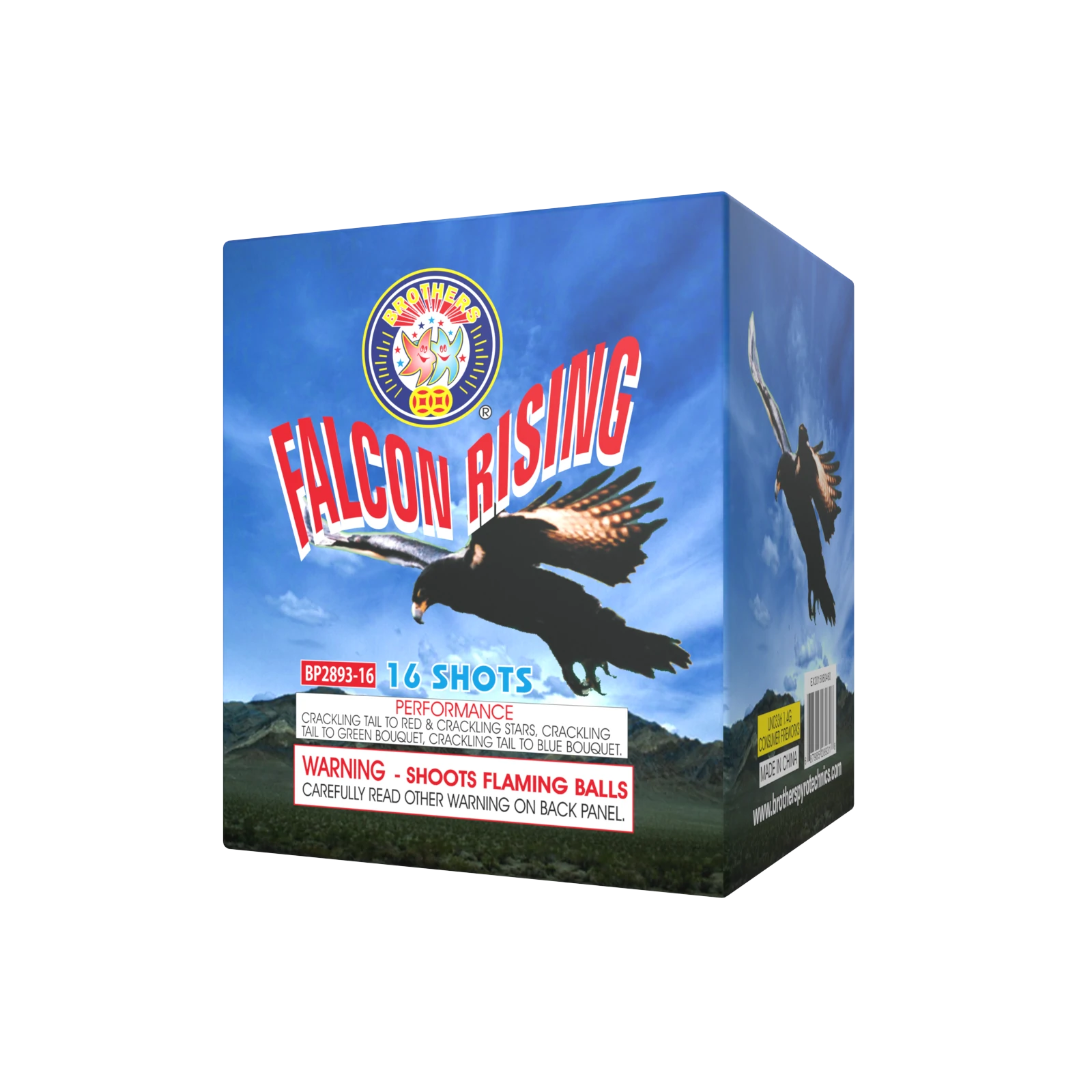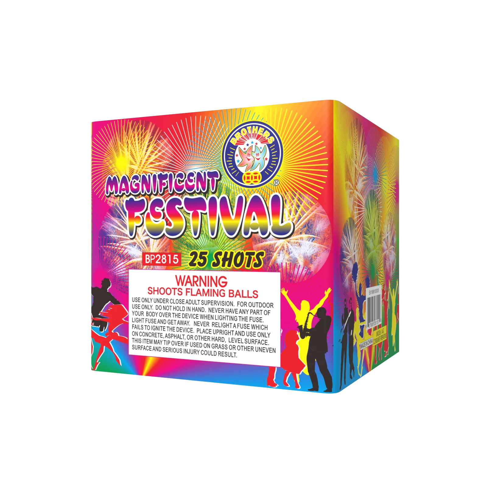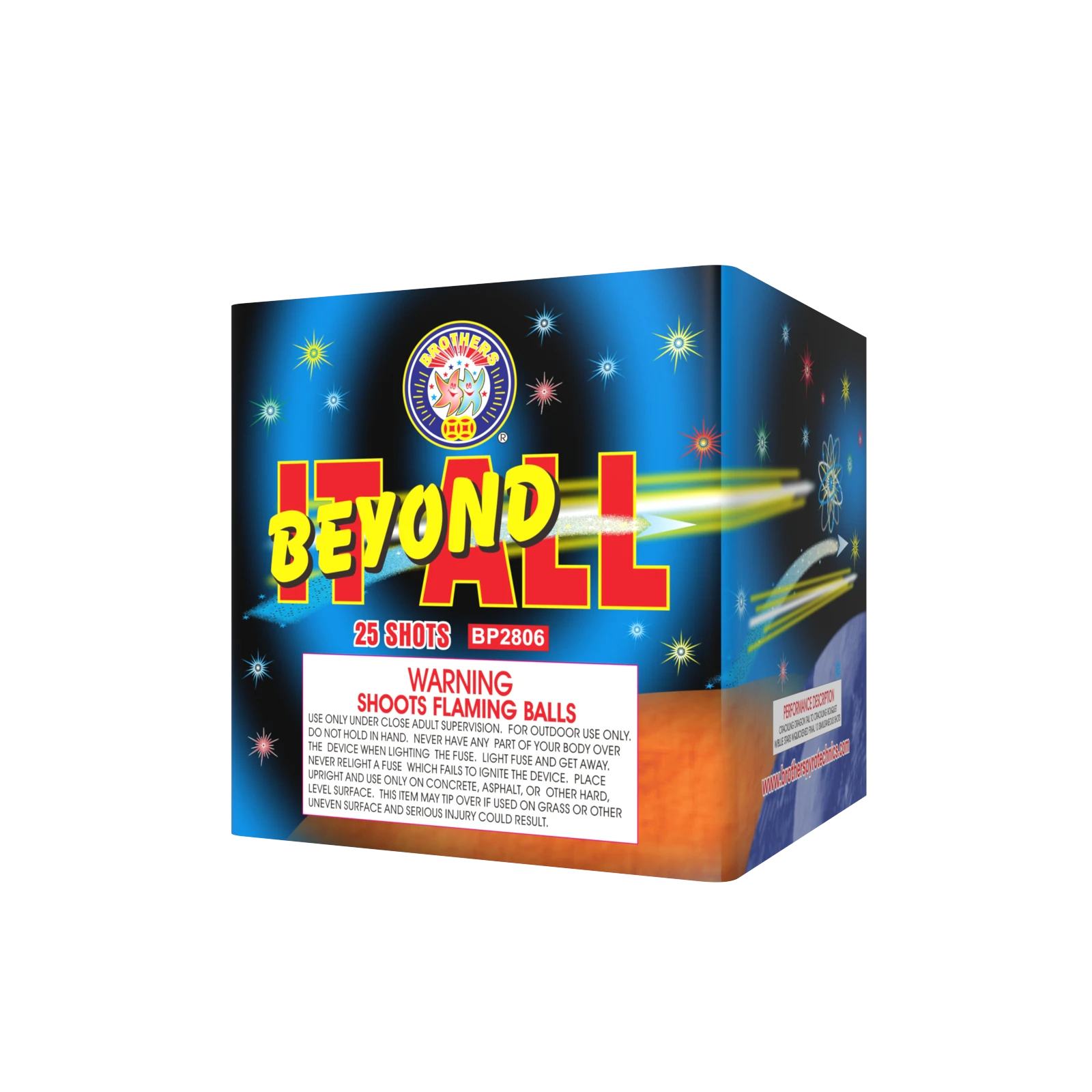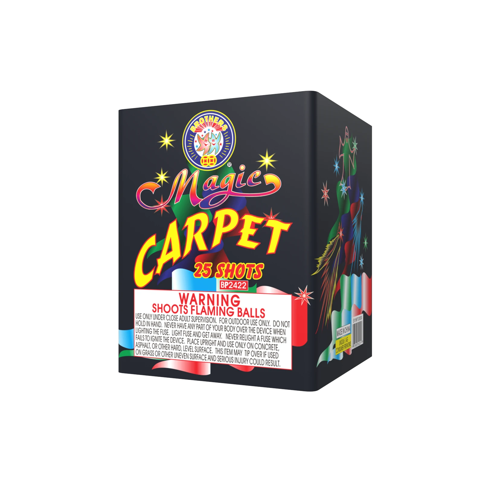 Red, white tail to red, white bouquets, blue tail to blue stars, green tail to multi-color spinner with reports, crackling tail to crackling bouquets, 5 shots at a time. 25 SHOTS