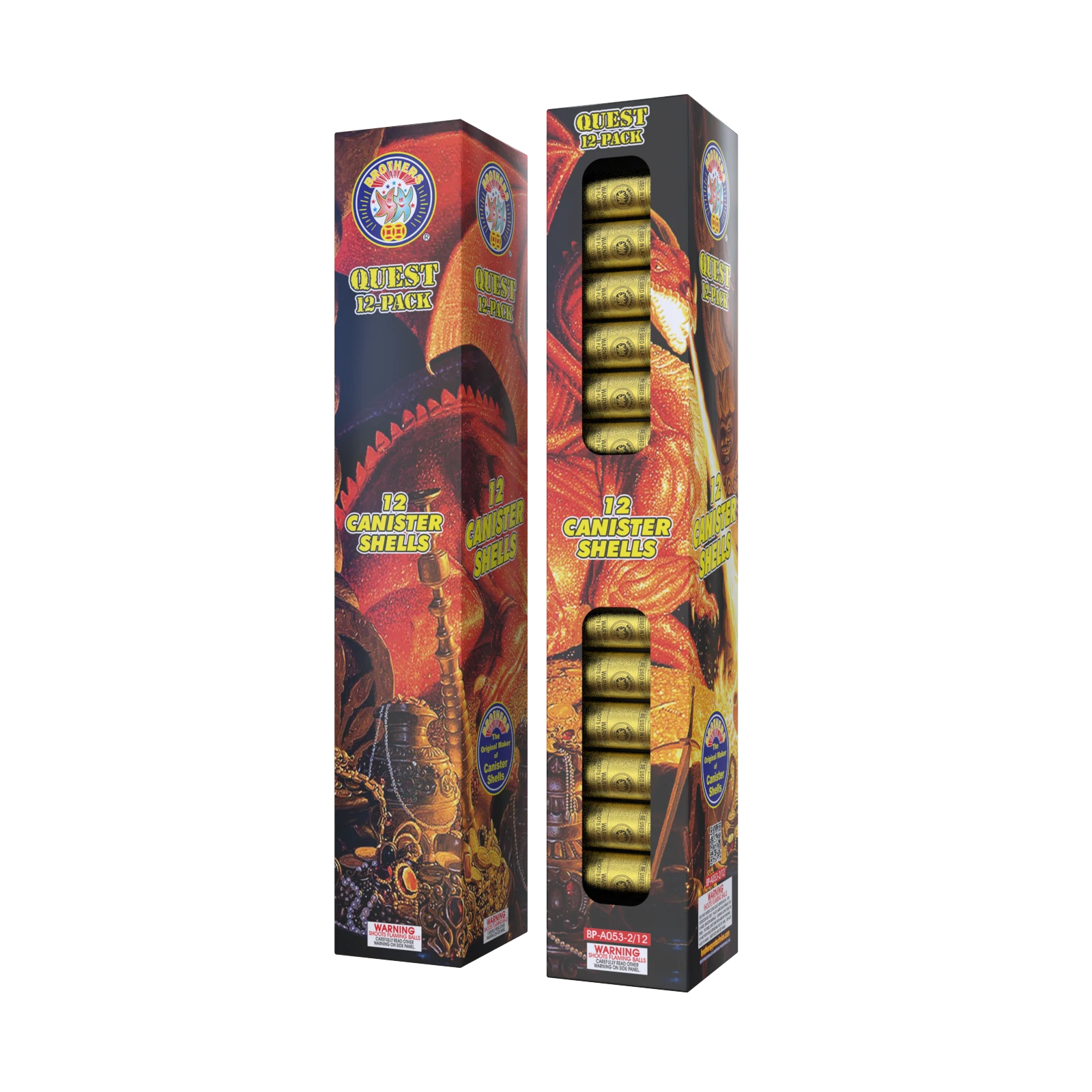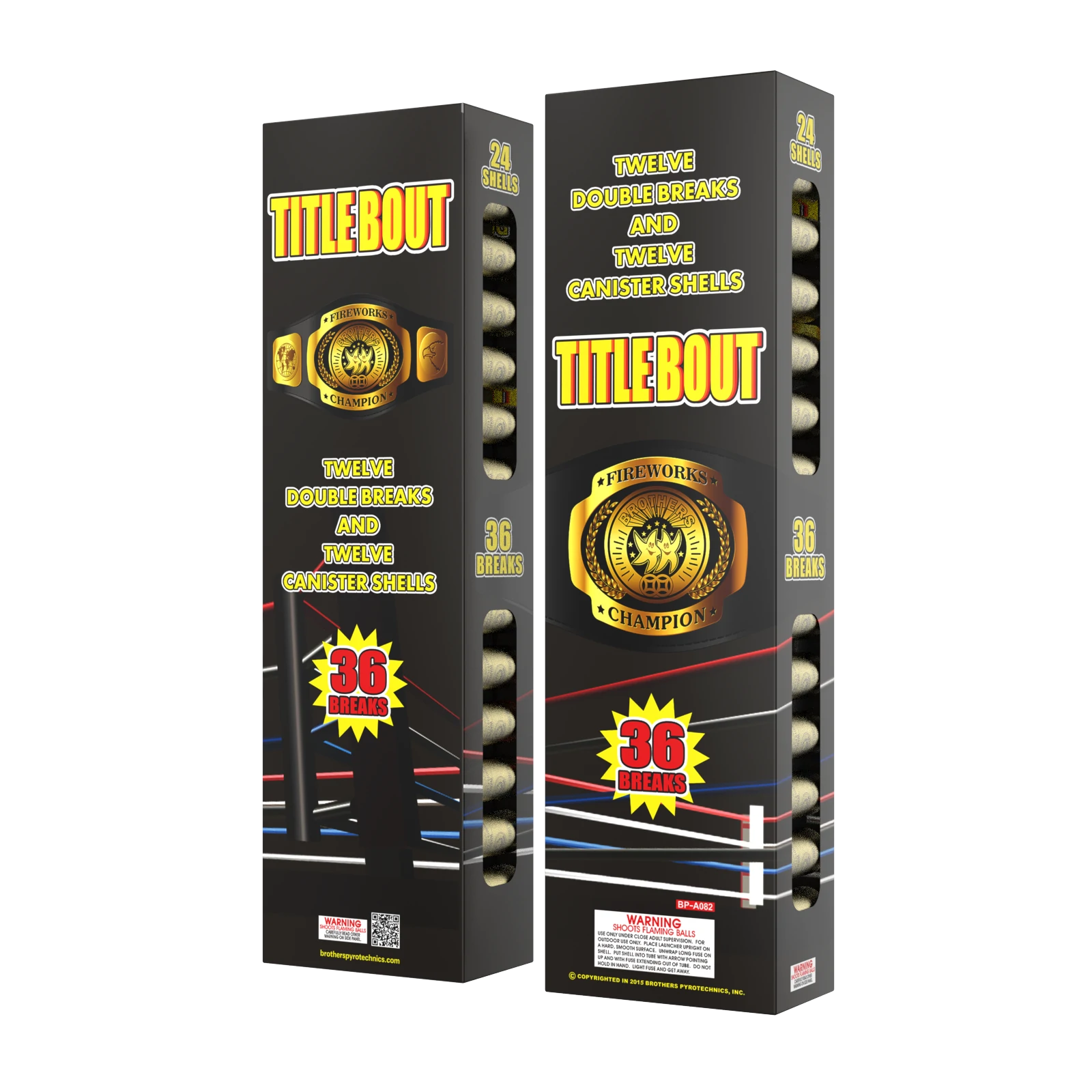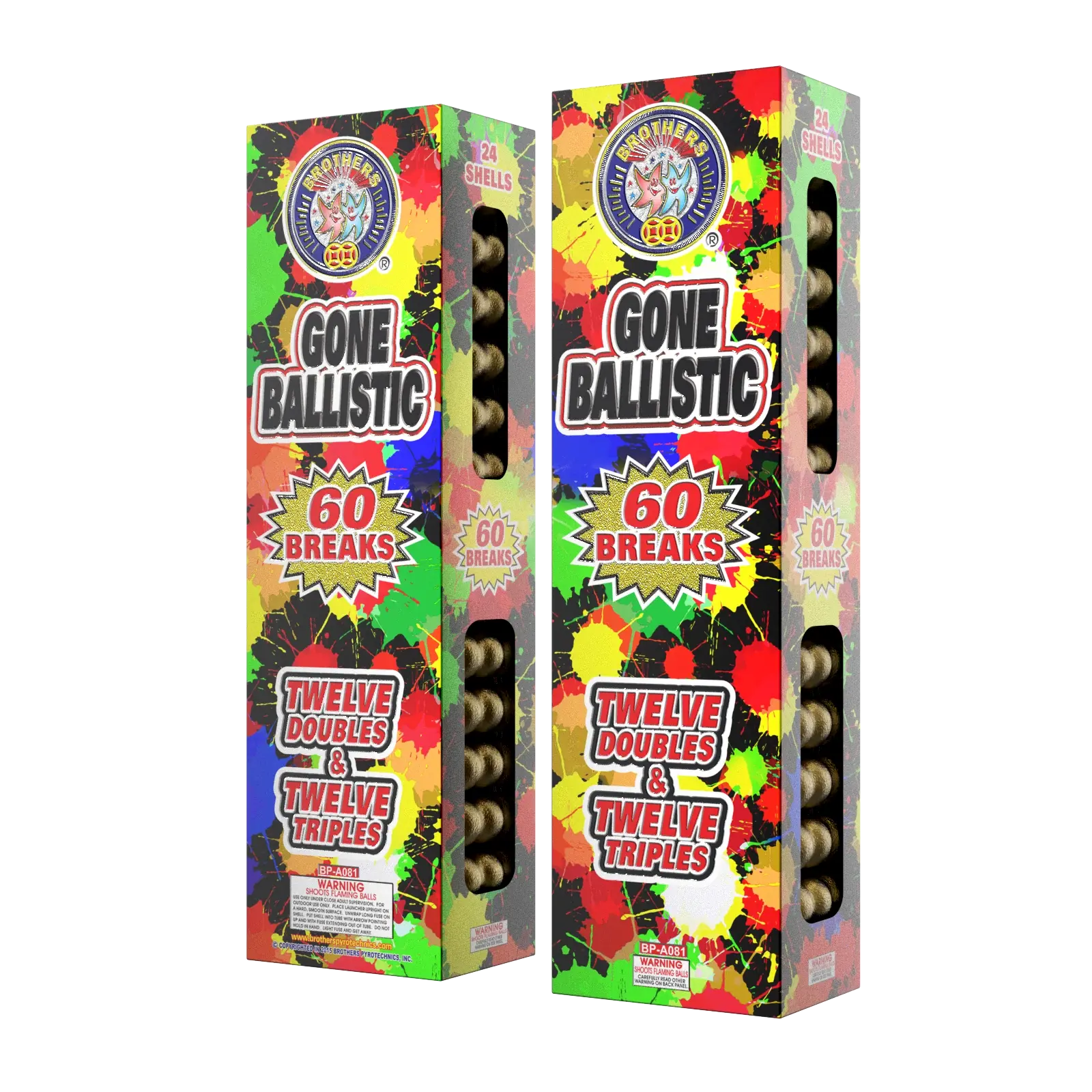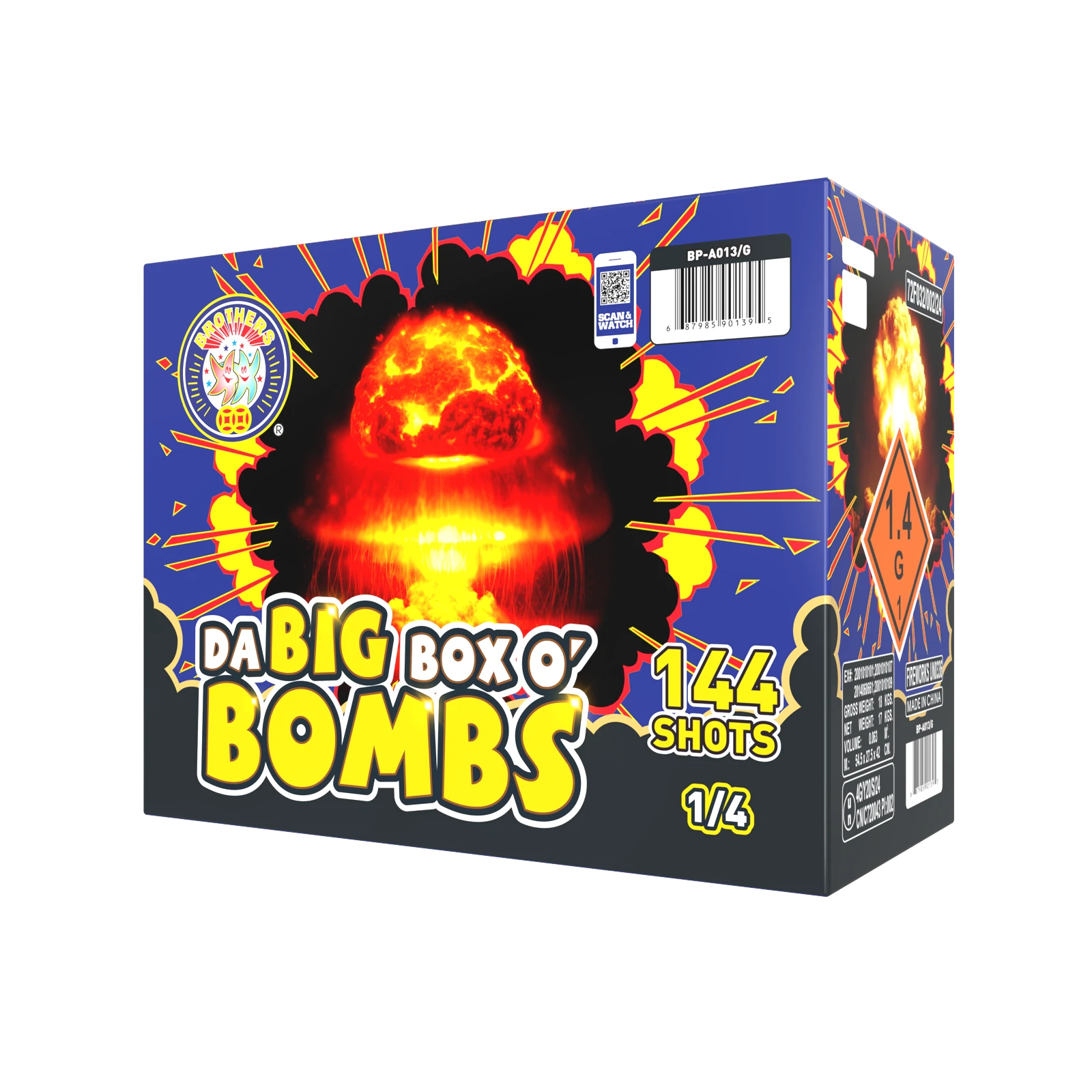 An attention grabbing show of alternating red crackling stars, green bouquets with crackling tail and blue bouquets with crackling tails. Twelve of the 36 shots in a HUGE finale.