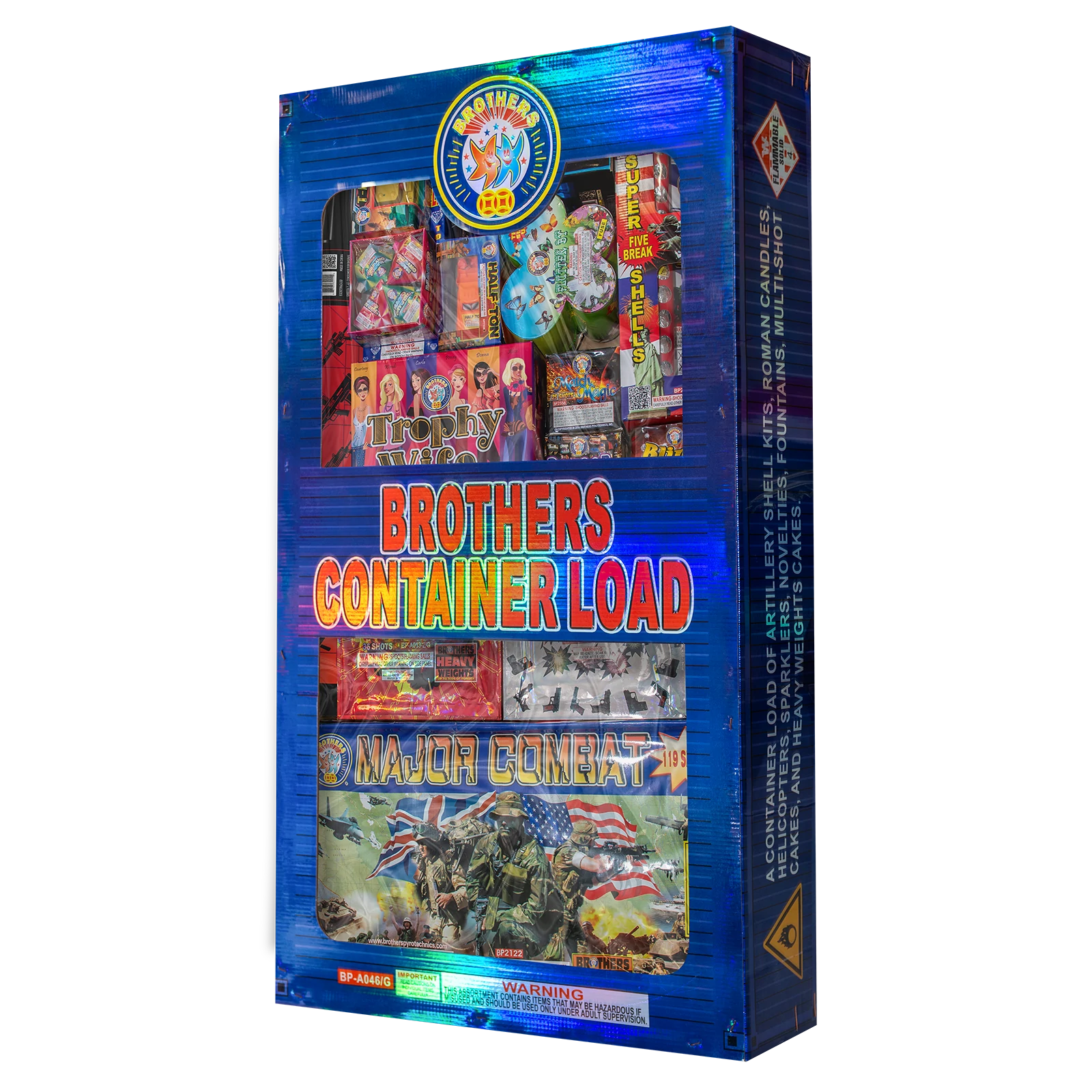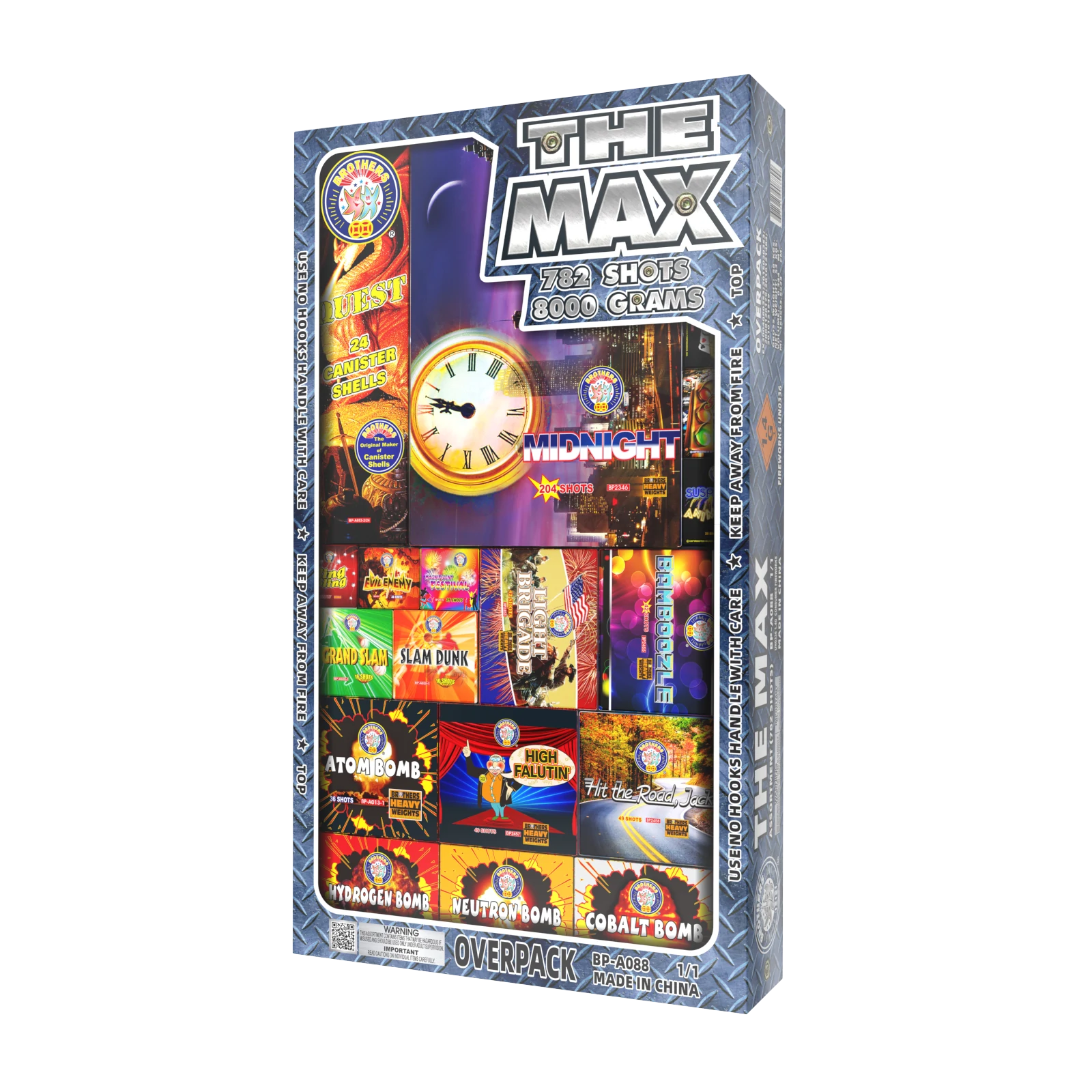 1. Crackling and blue sparkle with tail. 2. White flashing with two whistles and tail. 3. Blue stars with bees and tail. 4. Red, white, blue and reports with tail. 5. Blue stars with double spinners and tail. 6. Crackling and blue flower double shells wit