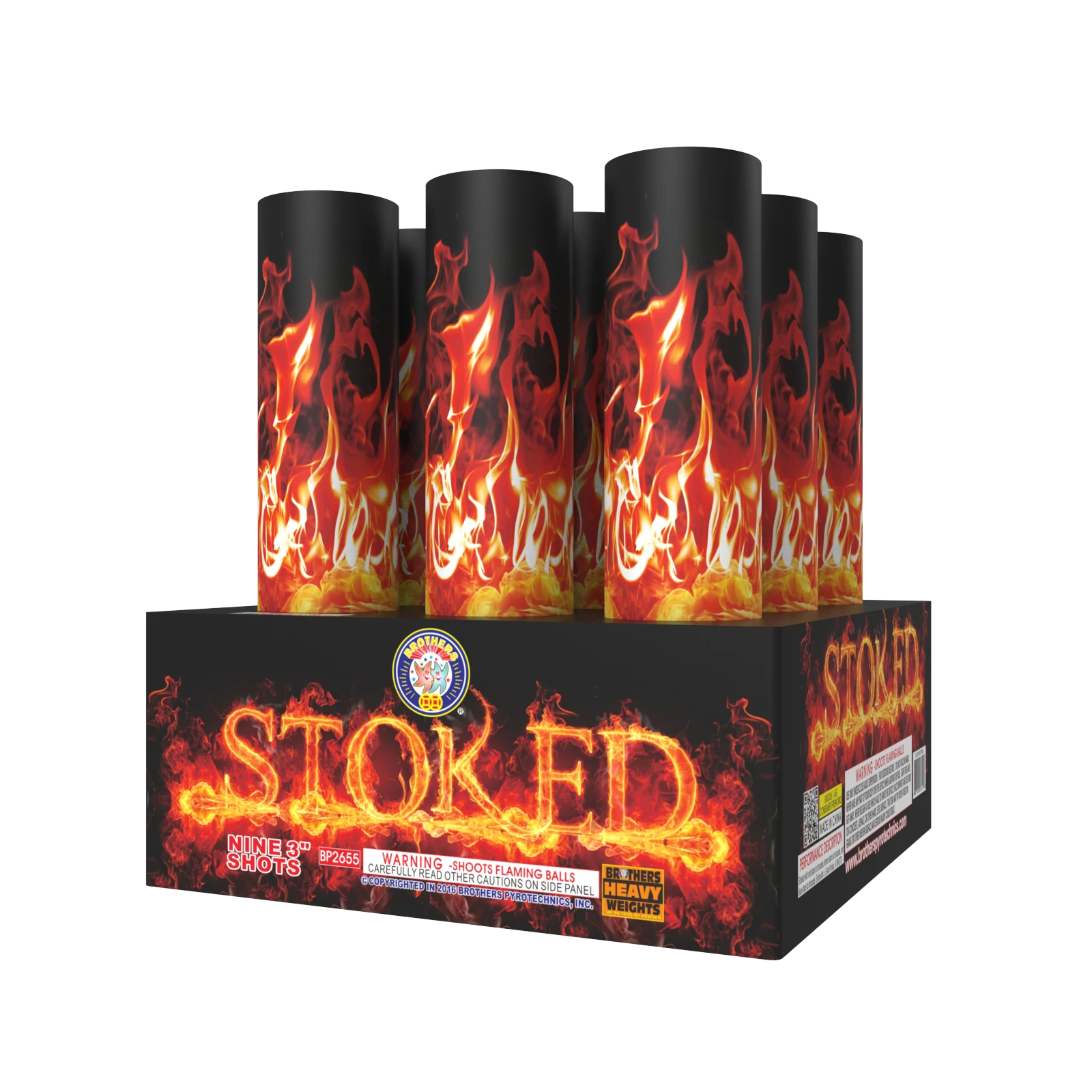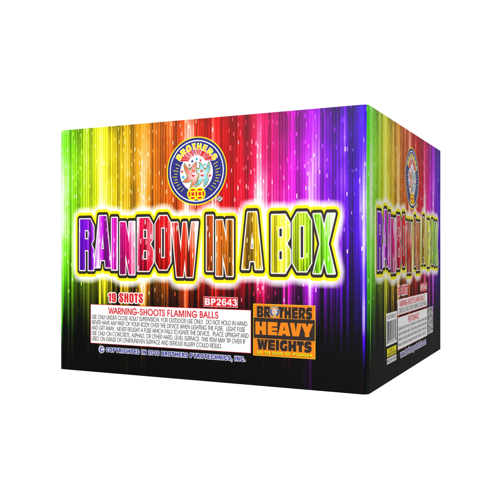 Spread across the sky - purple tails to red, green, yellow, purple and blue delayed palms. Purple tails to purple palms with green dahlia and yellow palms with red dahlia. Ends with a three-shot finale of silver tails to orange palms with crackling. 19 SHOTS