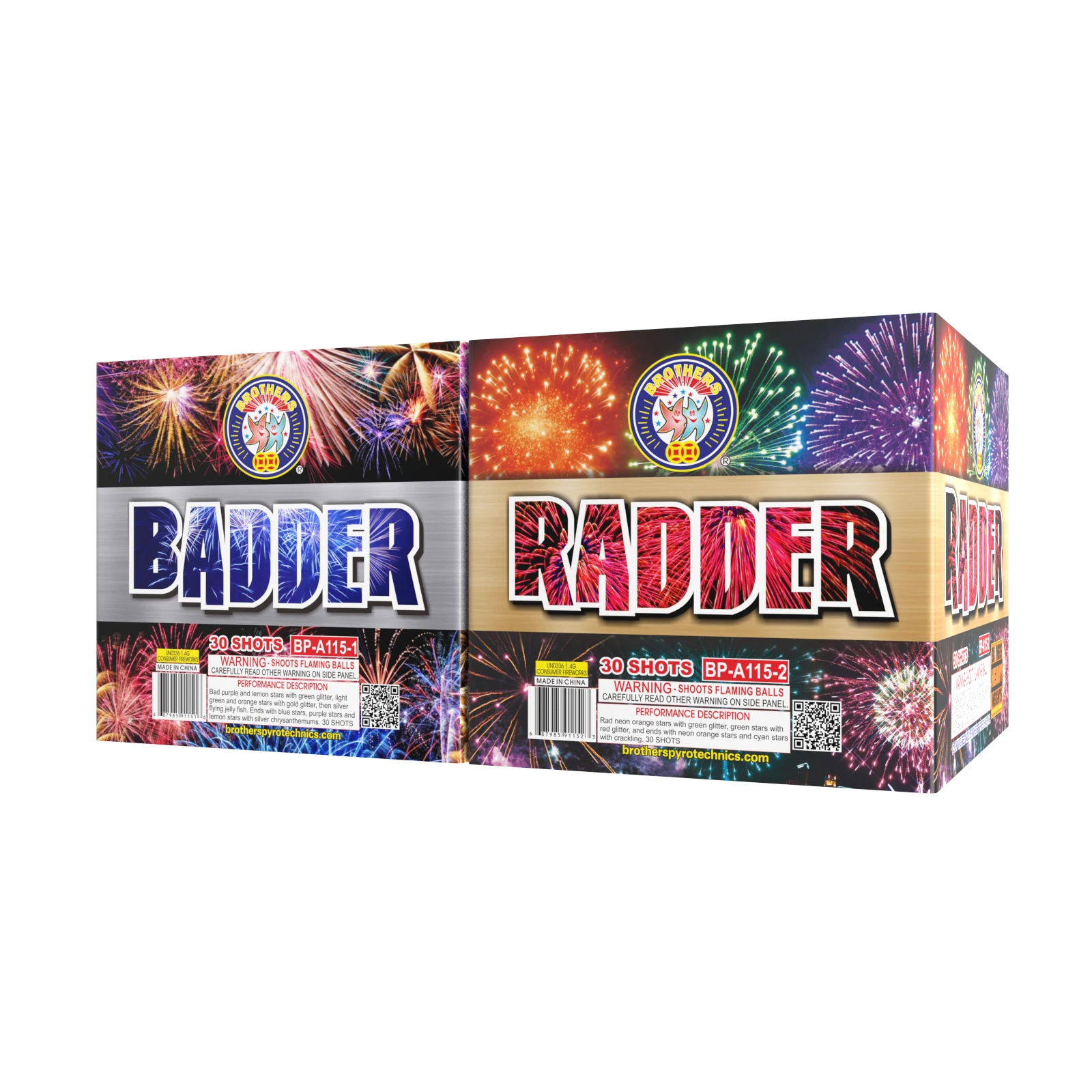 Radder - BP-A115-2: rad neon orange stars with green glitter, green stars with red glitter, and ends with neon orange stars and cyan stars with crackling. 30 SHOTS
