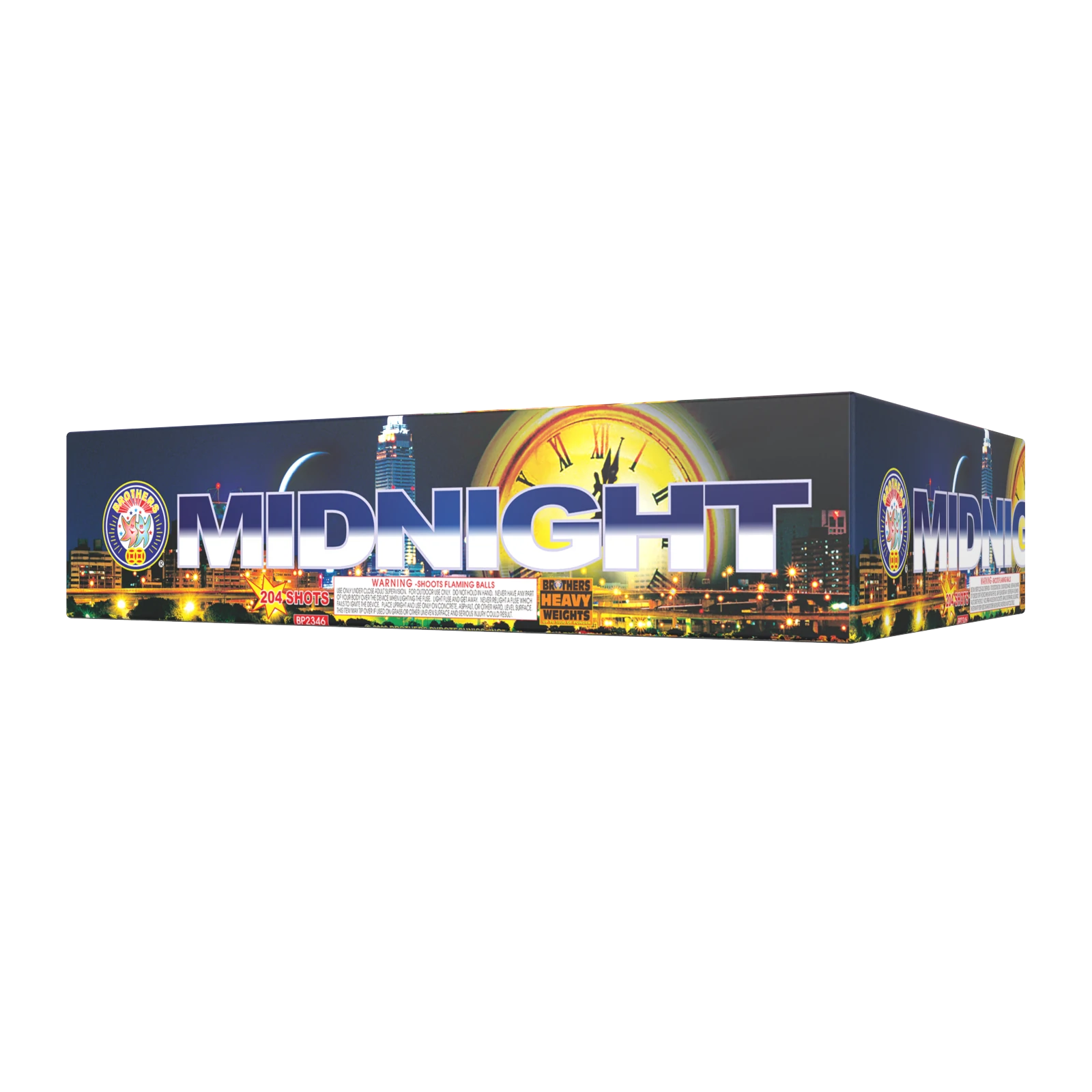 A middle of the night fire of z-shaped multi-colored stars and crackling comet tails to shots of red tails to red palms and crackling, then multi-colored stars and silver whistling tails to three shot finale of silver tails to crackling. 204 SHOTS