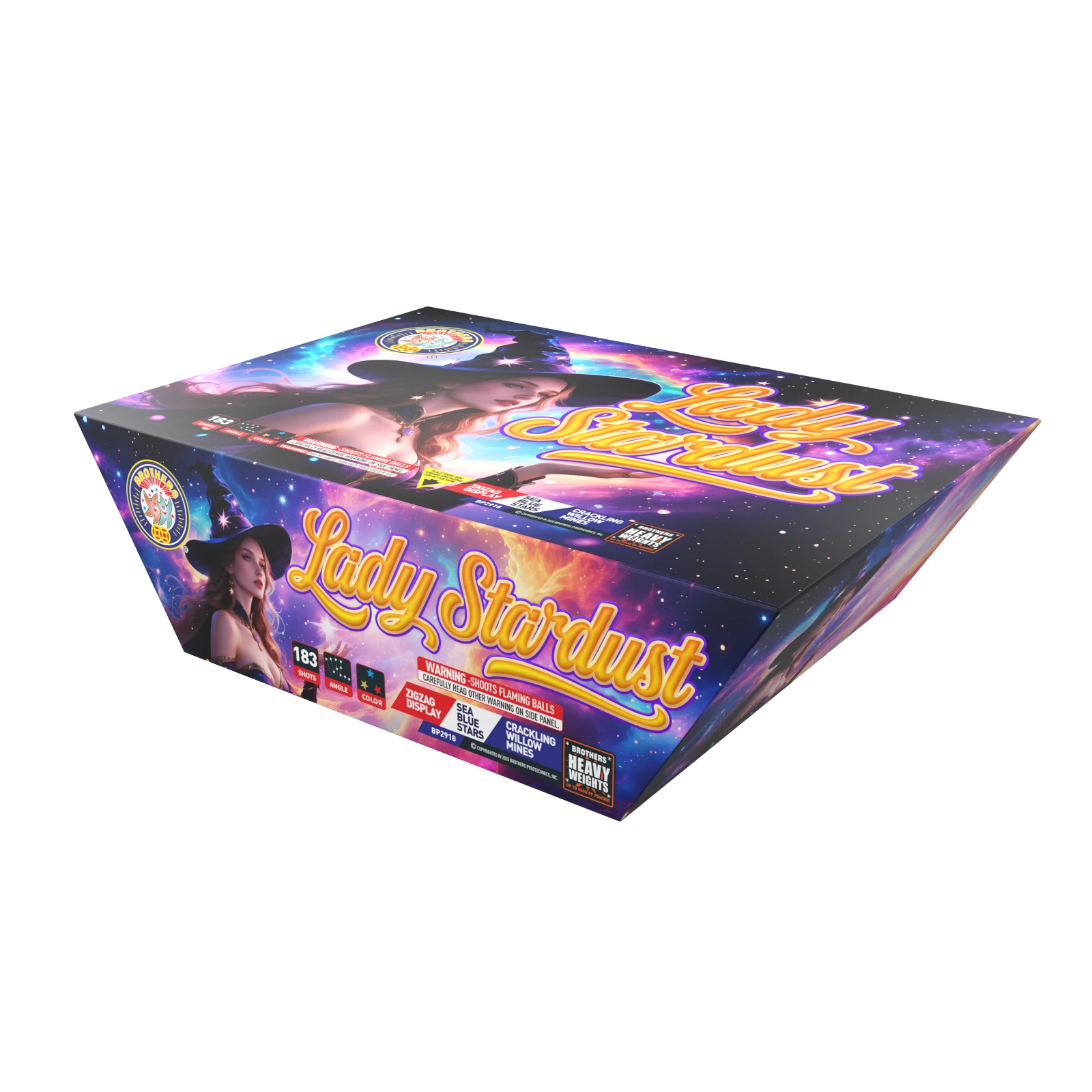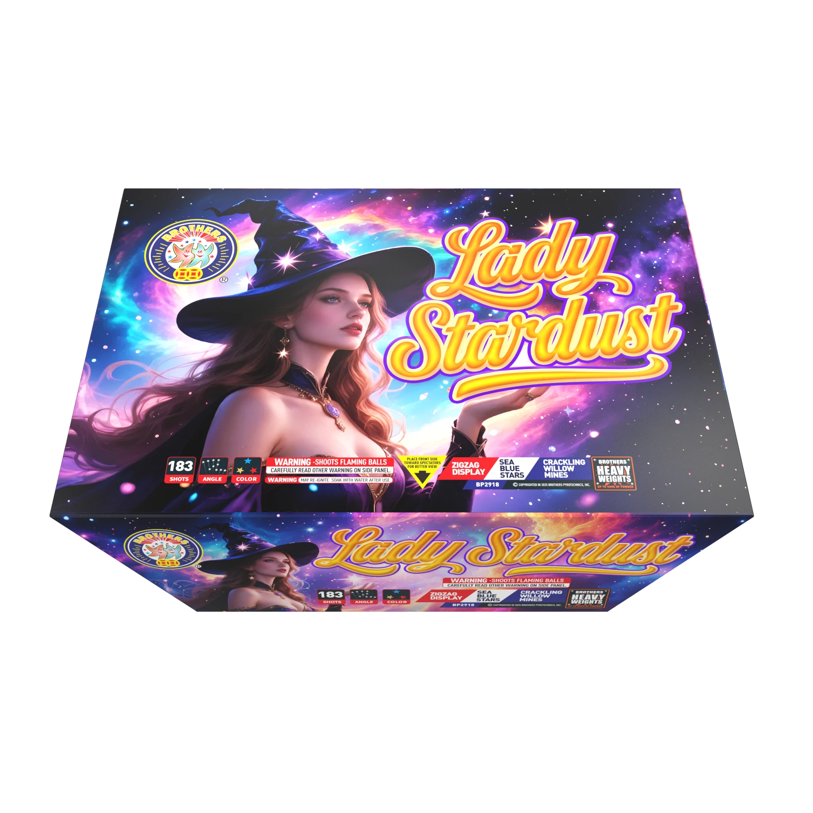 Back and forth across the sky scattering crackling willows with red and blue stars and ending with red dahlias and blue stars with chrysanthemums.183 SHOTS