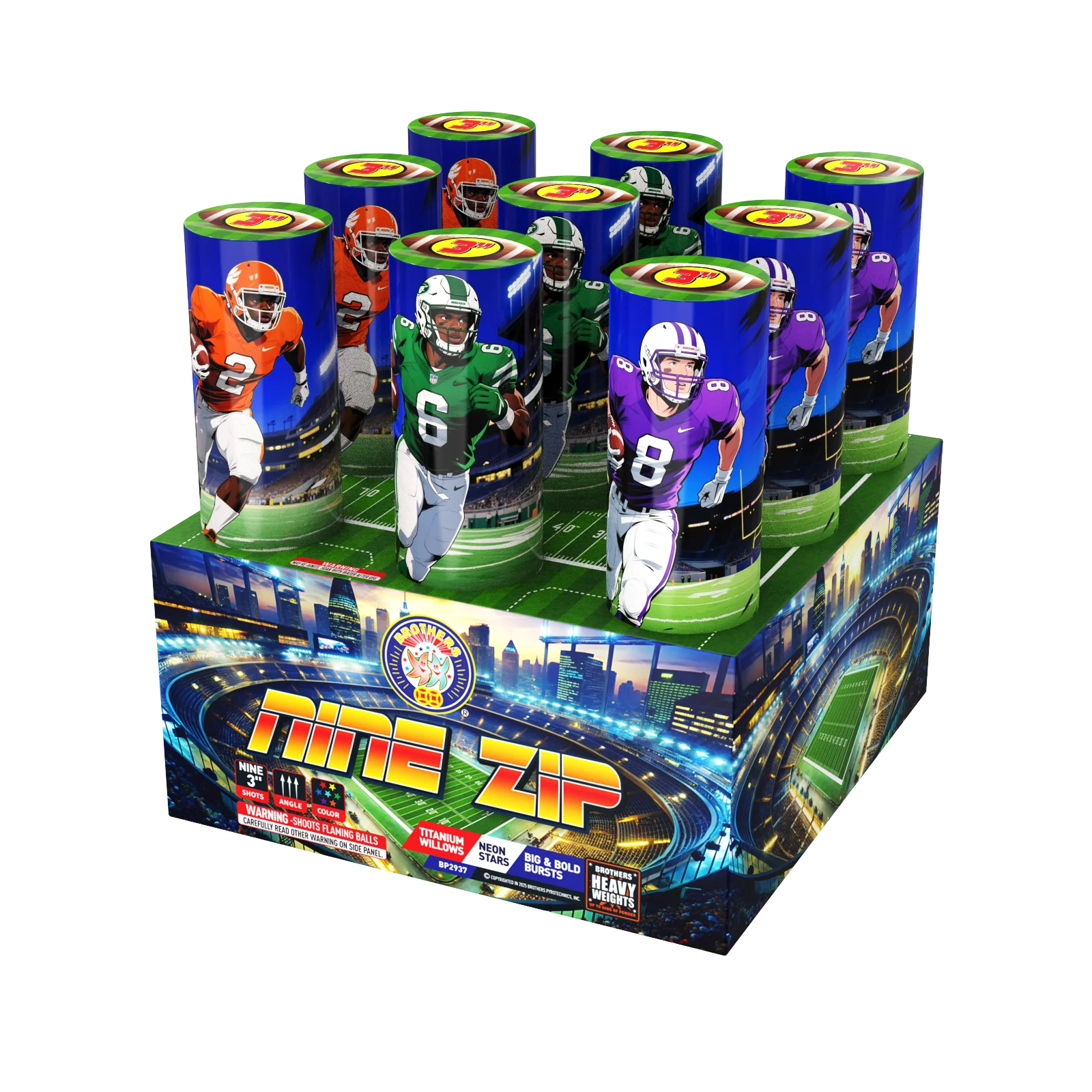 A sure win of titanium willows with neon green comets, neon purple comets, neon orange comets and neon blue comets. Ends with a 2-shot finale of titanium willows with neon green and neon blue comets. 9 SHOTS.