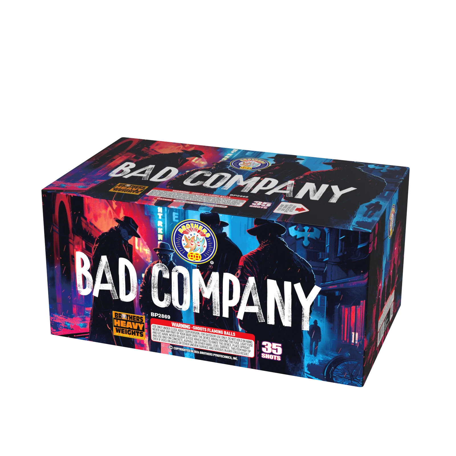 Bad Company? You judge. Three shots of brocade with silver glitter, then silver glittering tails to multicolored stars with crackling chrysanthemums. Next, crackling mines to silver palms with red and green stars with silver glitter and a three-shot final