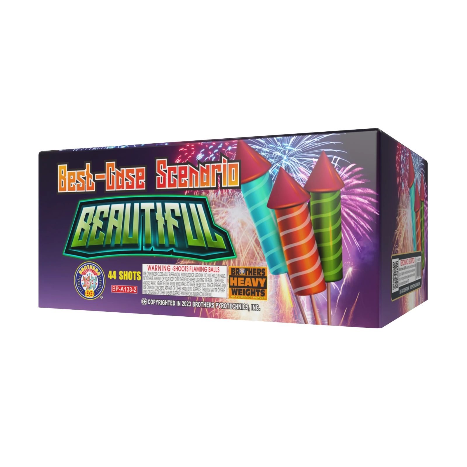 Silver swirling tails, silver tails to purple stars with silver glitter, and three-stage whistles. Then yellow tails to lemon stars with red glitter, silver swirling tails, silver tails to purple stars with crackling flowers, and 3-stage whistles. Finally, yellow tails to lemon stars with crackling flowers. 44 SHOTS