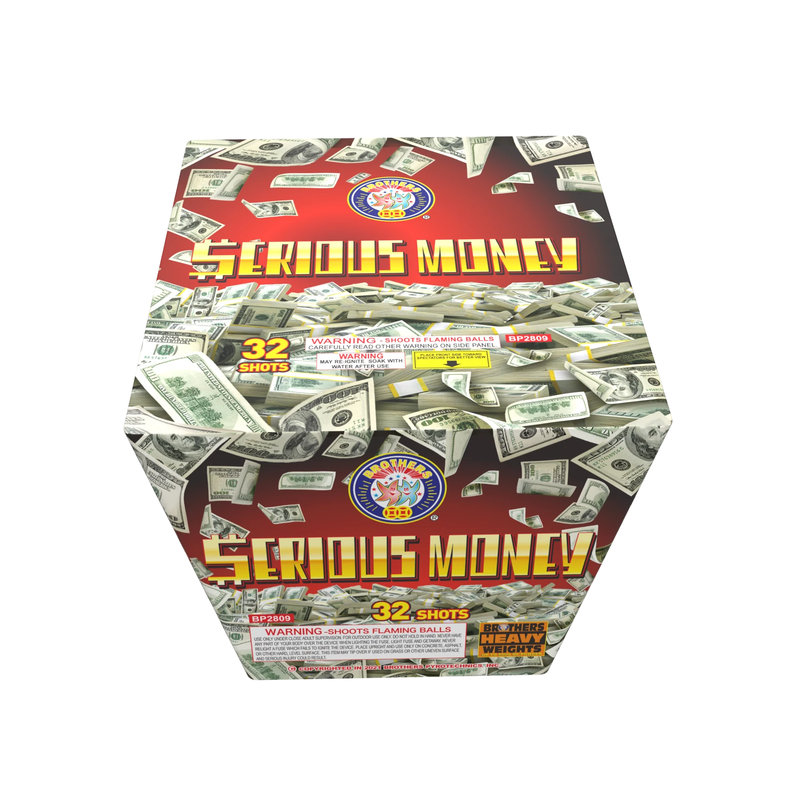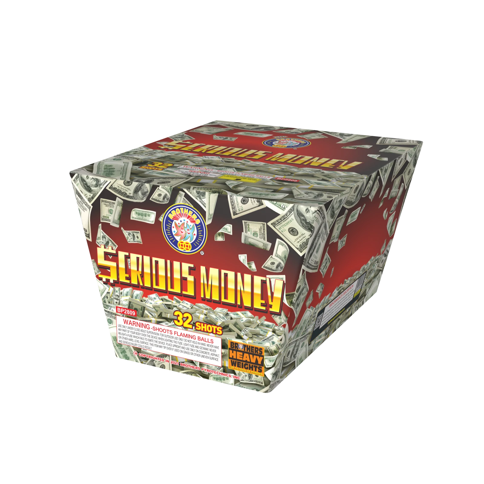 Lots of bang for your bucks here with silver glittering mines to alternating red, green, blue and lemon comet tails, then blue palms with red and gold glitter, and orange dahlia with silver glitter. Ends with silver and gold palms with gold chrysanthemums. 32 SHOTS