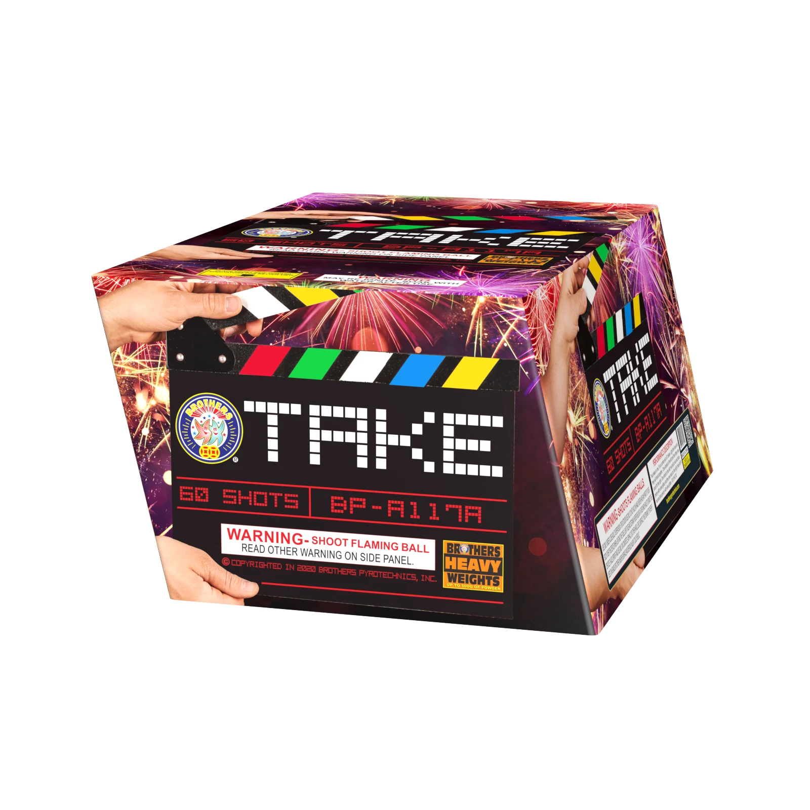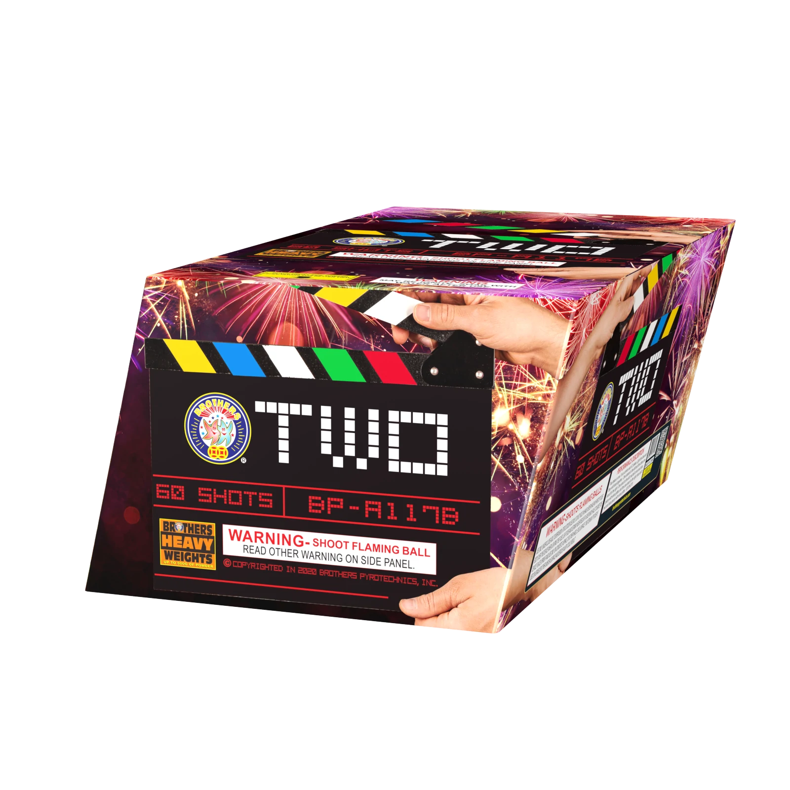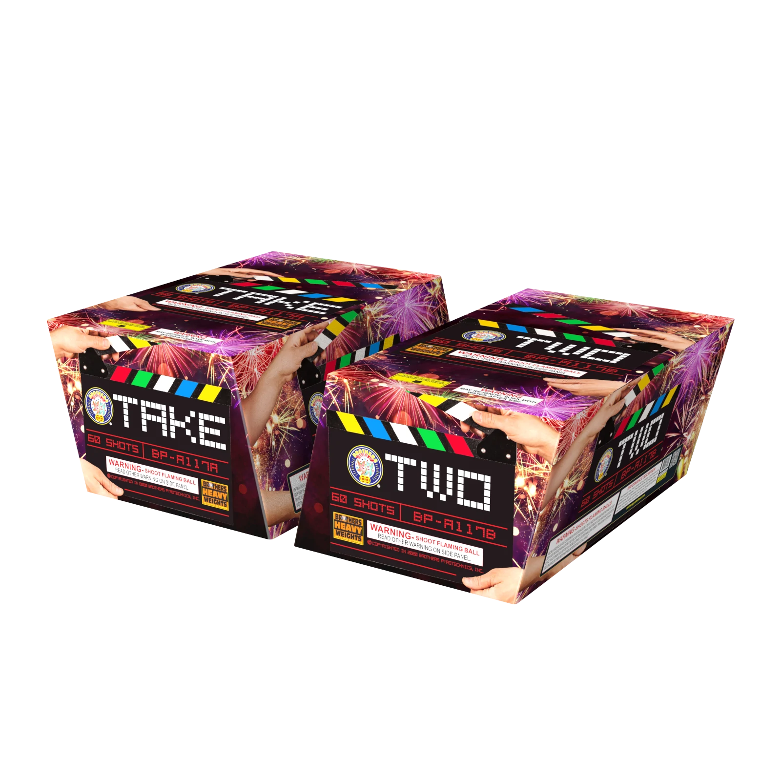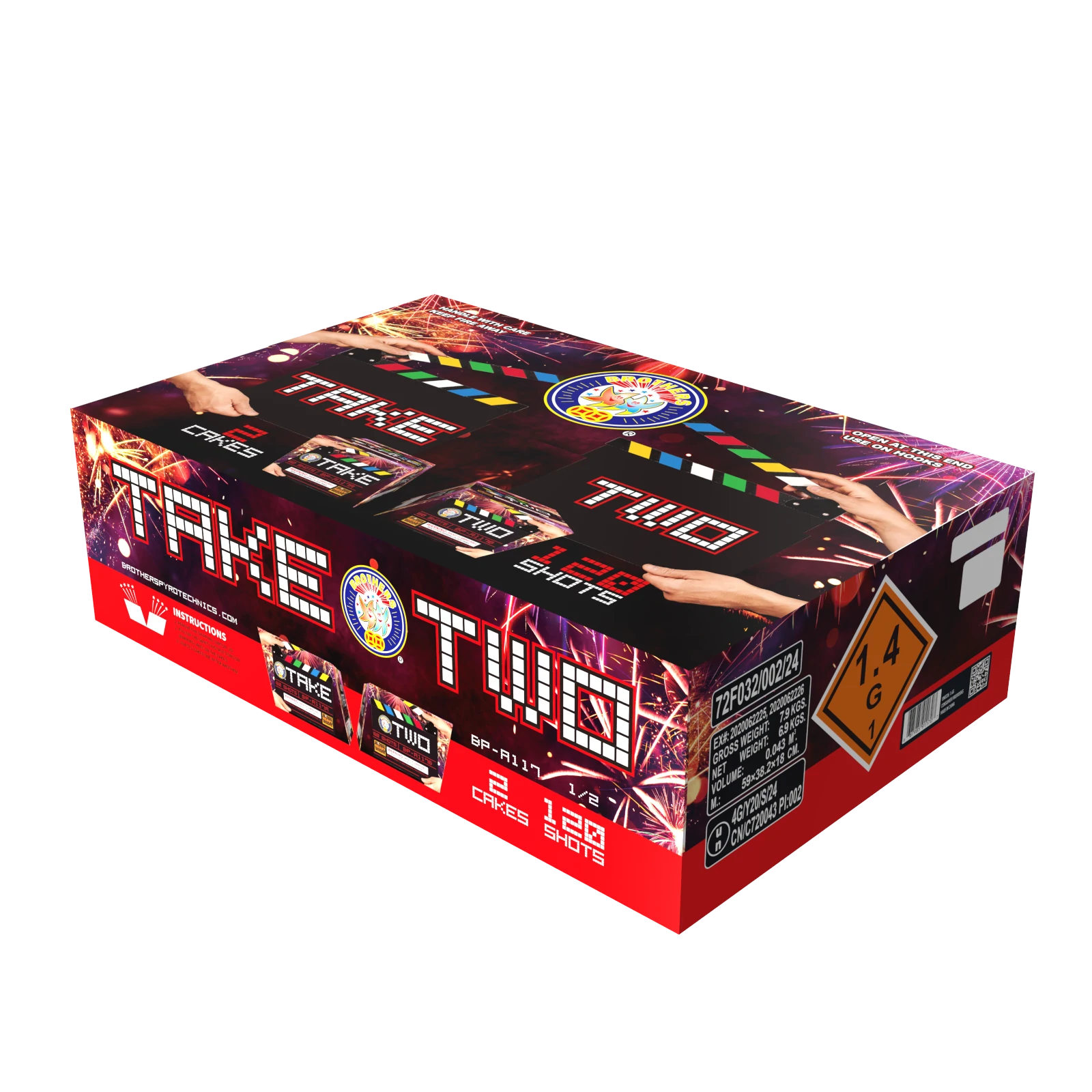 Two takes in one. A combo set of two cakes. Light the fuse and they will shoot together: one shoots to the left and the other shoots to the right. Shooting to the left: red tail to red and blue peony with silver glitter. Shooting to the right: blue tail to red and blue peony with silver glitter. 120 SHOTS