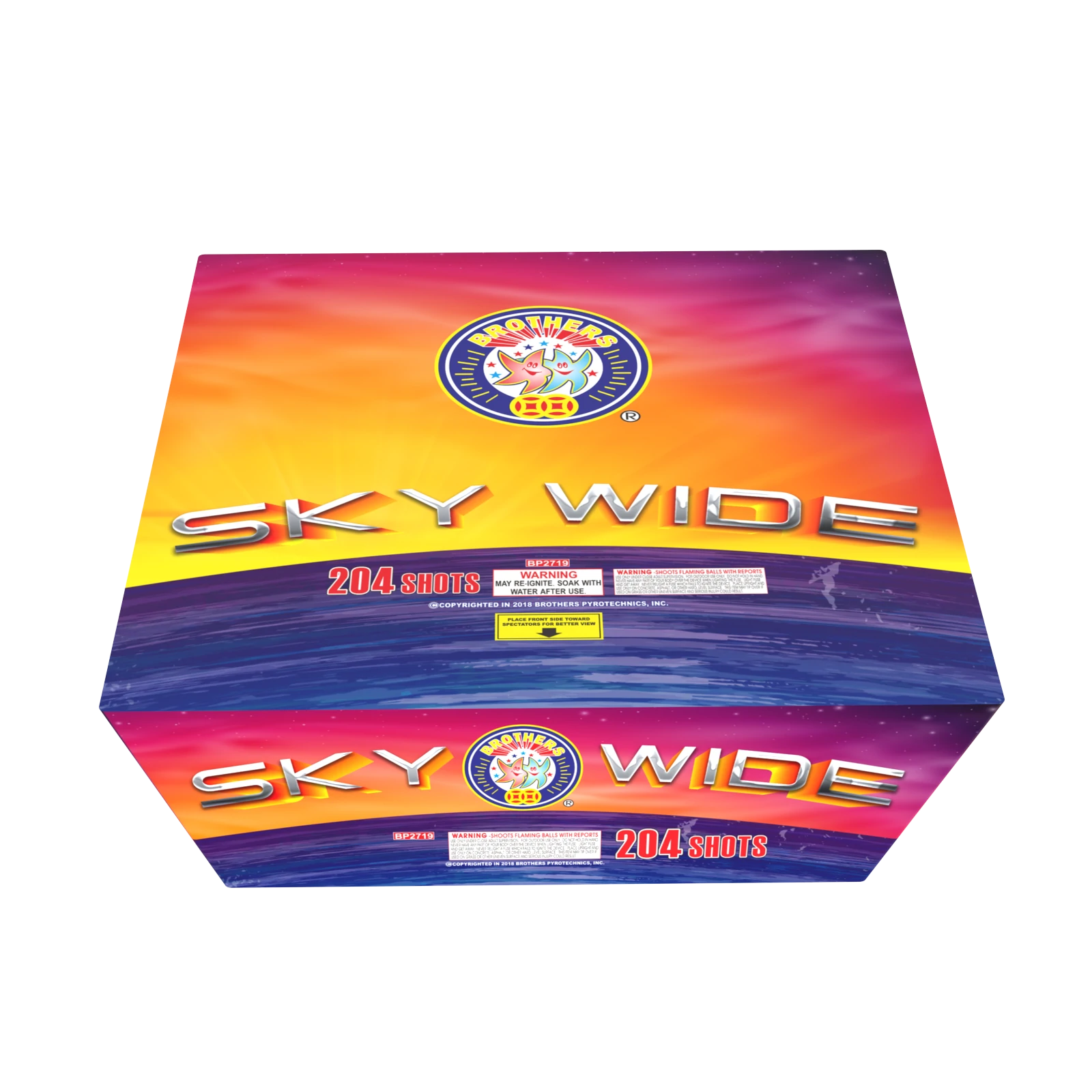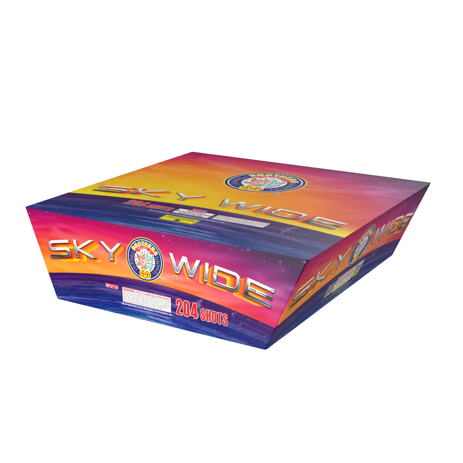 Get your eyeful from a sky full of blue, peach, green and lemon stars with reports, then gold willows with titanium reports. 204 SHOTS