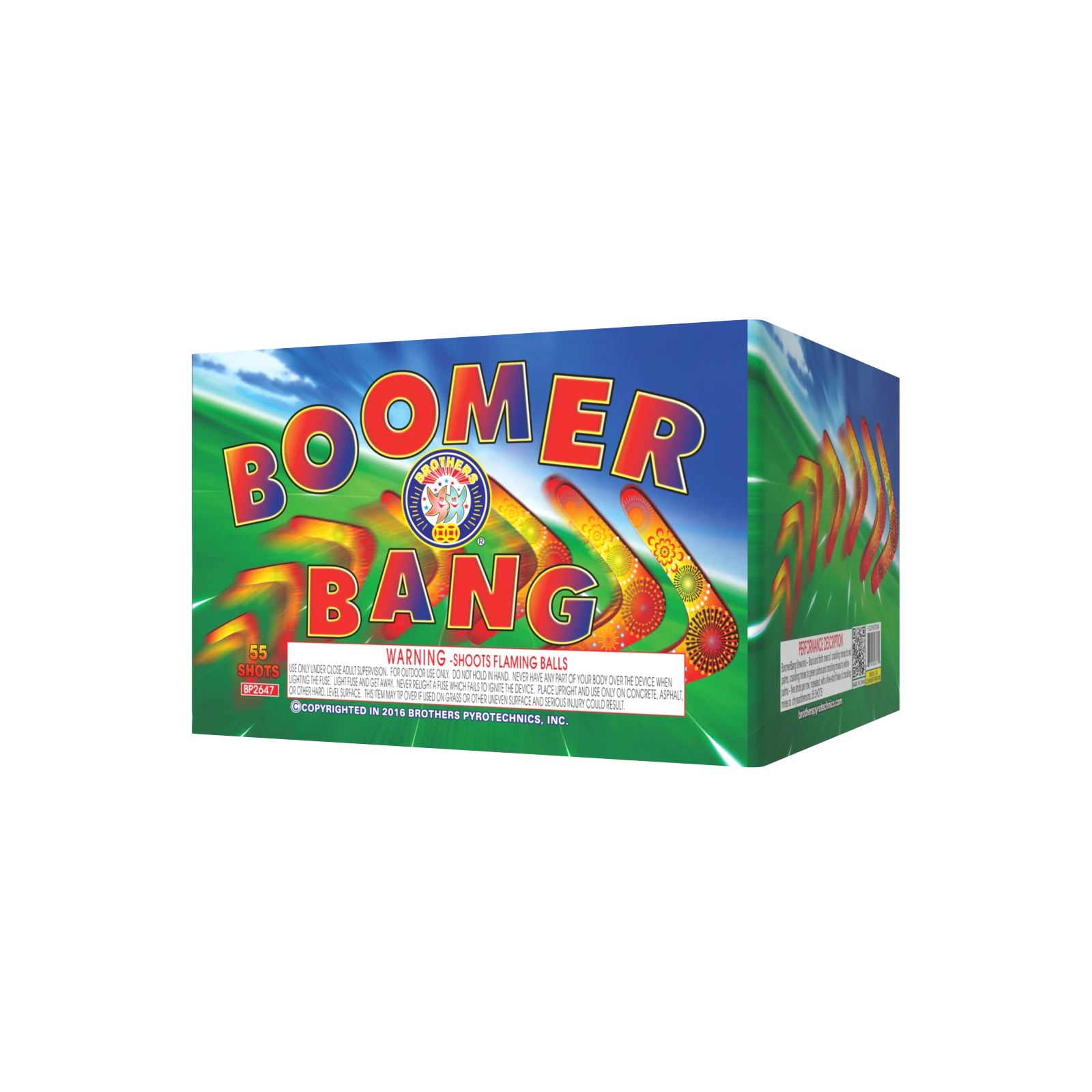 BoomerBang fireworks – back and forth rows of crackling mines to red palms, crackling mines to green palms and crackling mines to yellow palms – five shots per row, repeated, with a five-shot finale of crackling mines to chrysanthemums. 55 SHOTS