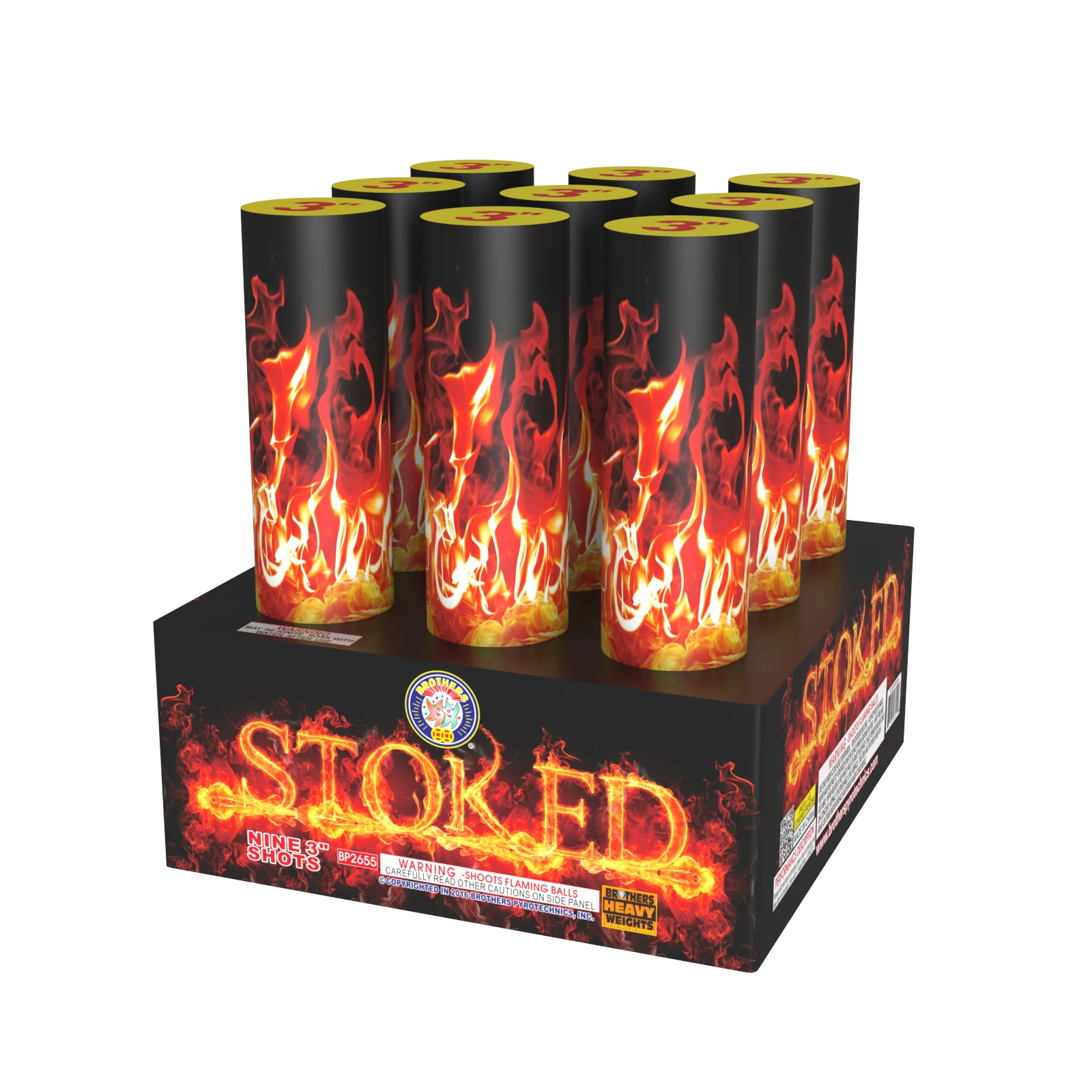 Stoked with red stars to brocade, lemon stars to brocade, and blue stars to brocade. Ends with a three-shot finale. 9 SHOTS